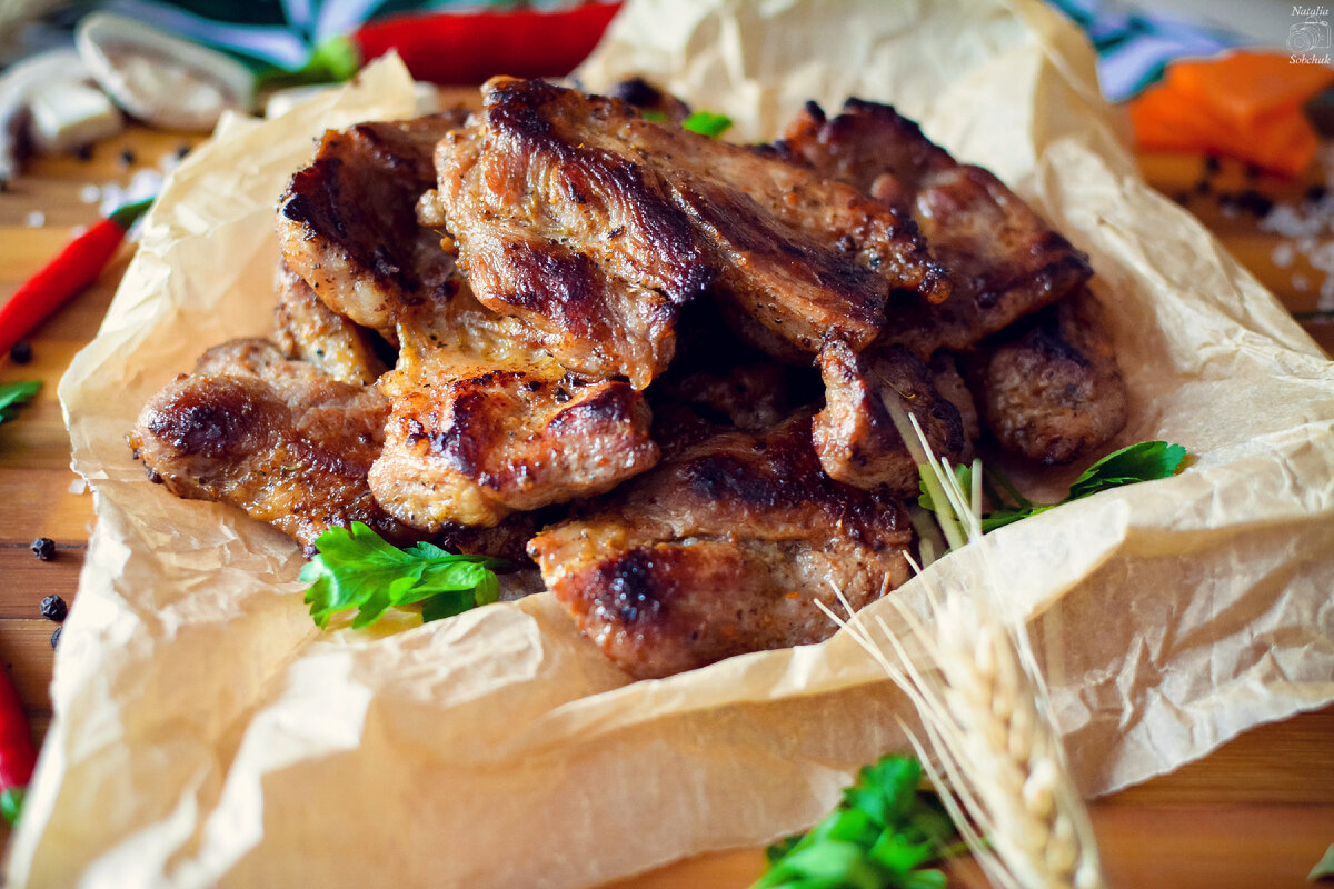 1. Свинину тщательно промыть и нарезать на куски толщиной около 2 см. Это идеальная величина для равномерной прожарки. Приправить мясо солью, перцем и любимыми специями.