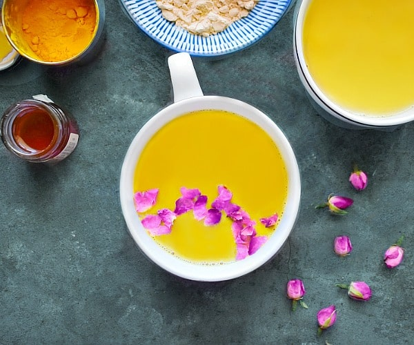 Нагрейте миндальное молоко, добавляя куркуму и корицу. После снятия с огня, добавьте кленовый сироп. По желанию, украсьте напиток лепестками шиповника и лавандой. Подавать горячим для максимального эффекта.