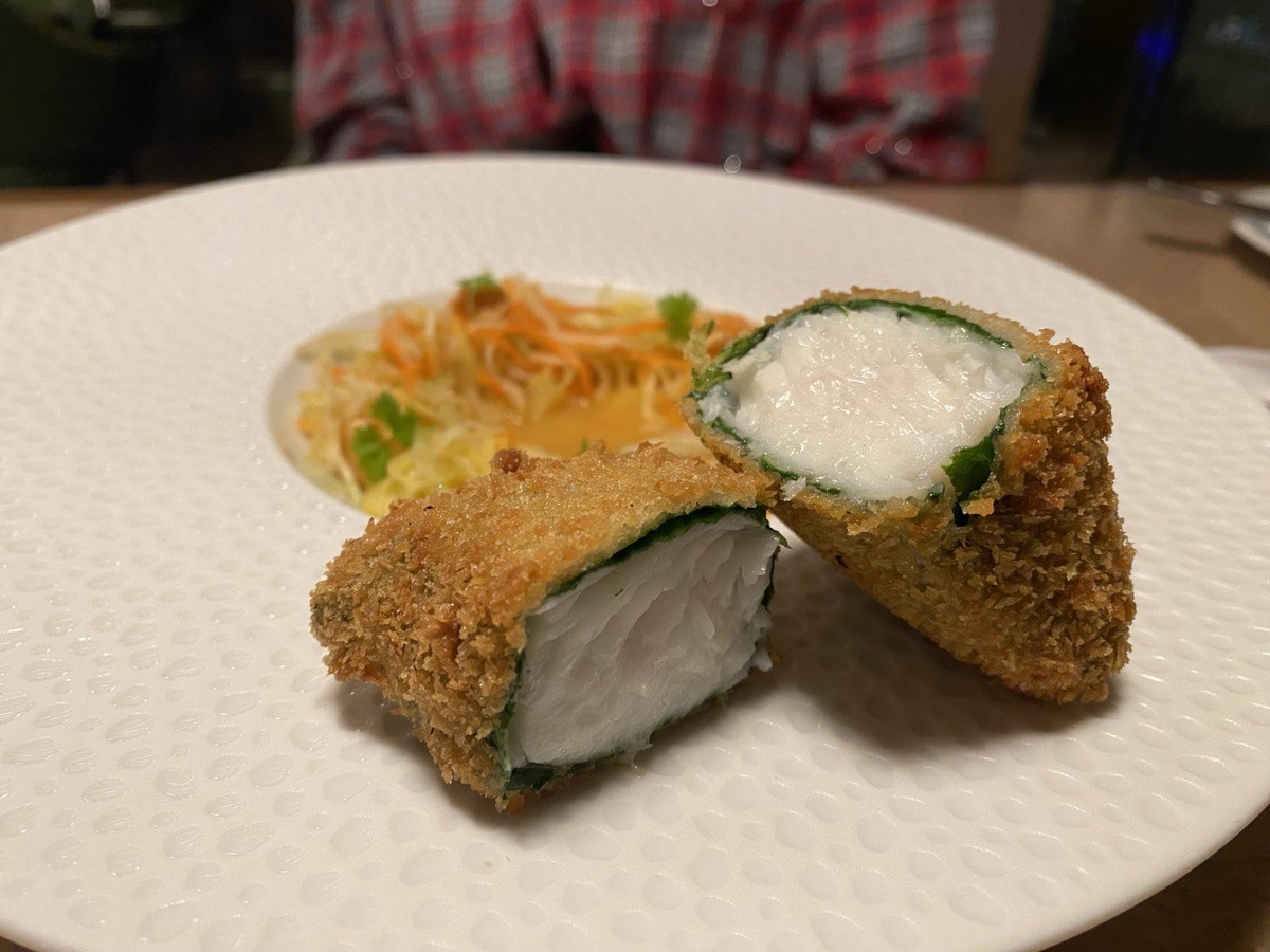 Продолжая гастрономическую экскурсию, гости могут выбрать между мидиями, запеченными в водорослях и краб-кейком с сезонными грибами, который подается в сливочно-томатном бульоне. Как дополнение — свежий хлеб, который отлично сочетается с насыщенным вкусом краба.