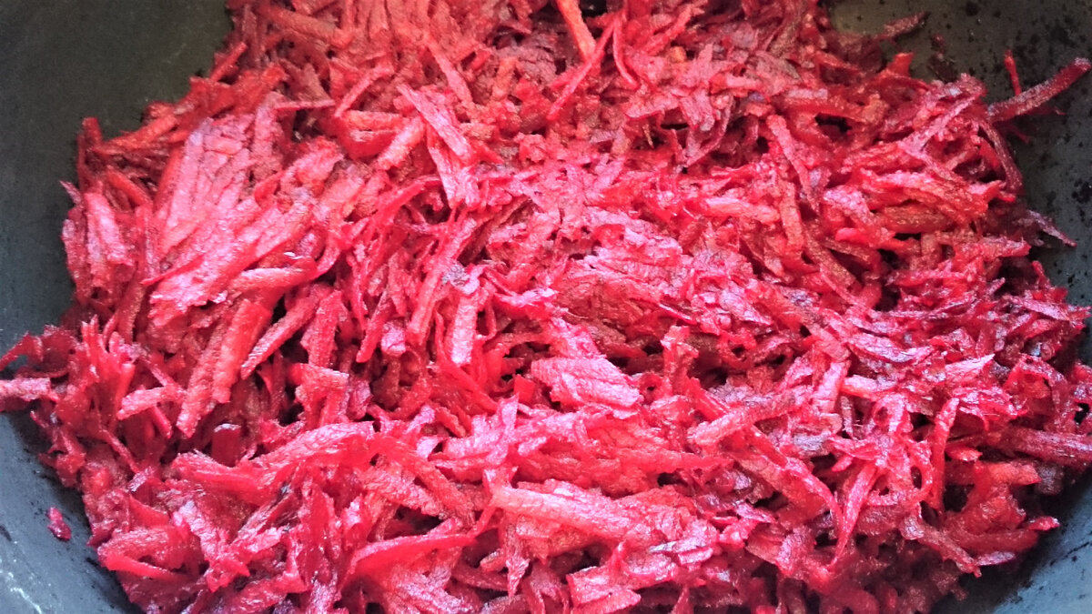Затем в сковороде разогревается растительное масло, куда выкладывается свекла. Она обжаривается несколько минут, после чего заливается водой и добавляется уксус, чтобы придать блюду особый вкус. Затем готовим на медленном огне в течение 15-20 минут.