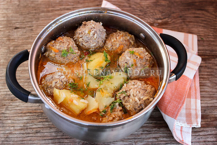Сегодня готовим тефтели с рисом, что прекрасно сочетаются с картофелем. В зависимости от того, сколько воды вы добавите, можно регулировать консистенцию — она может быть более жидкой, как у супа, или же плотной, как у второго блюда.