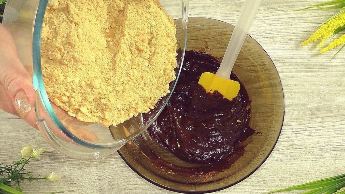 Теперь наступает очередь крошки из печенья — её тоже добавляем в шоколадную смесь.