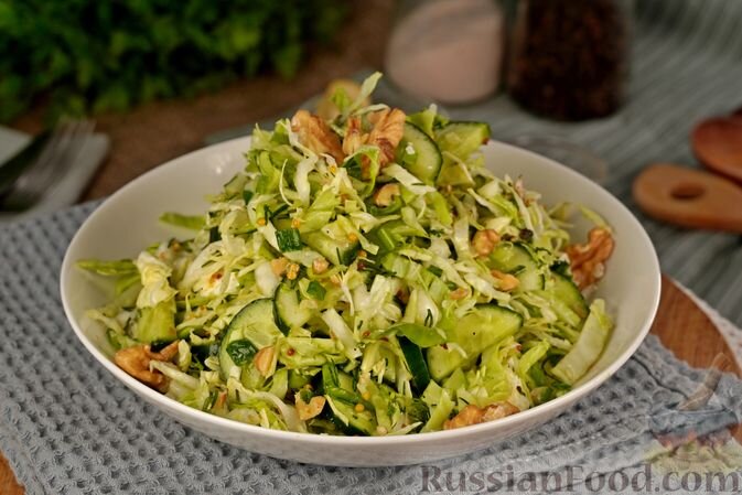 - Салат из молодого капусты с огурцами, фетой и грецкими орехами. Это легкое и яркое сочетание заправляется оливковым маслом, лимонным соком, медом и горчицей, что придаёт салату свежесть и уникальность.