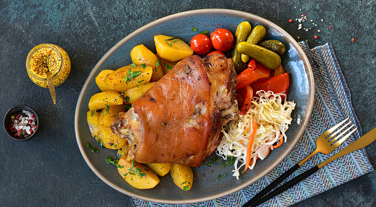 Подавайте свиную рульку с картофелем, овощами на гриле или салатом. Не забудьте добавить к блюду соус – горчица, хрен или томатные варианты прекрасно подойдут.