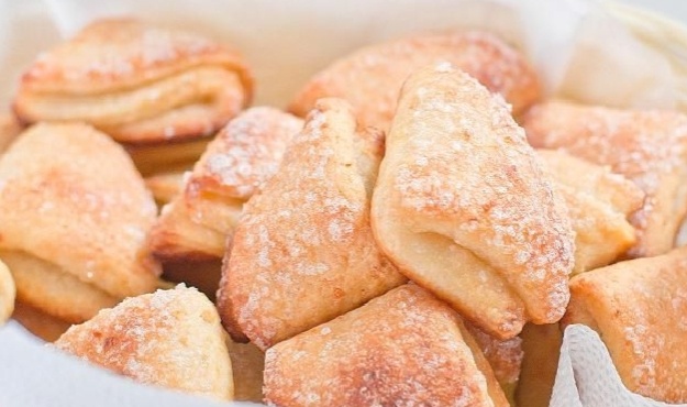 Разделите тесто на 3–4 части. На присыпанной мукой поверхности раскатайте одну из частей в пласт толщиной 0,5–0,7 см. Вырежьте кружочки при помощи стакана или формы (диаметром 6–8 см). Каждый кружок обмакните в сахар, сложите пополам с сахаром внутрь, и снова обмакните. Далее сложите еще раз, образовав треугольник, и выложите на противень с пергаментом.