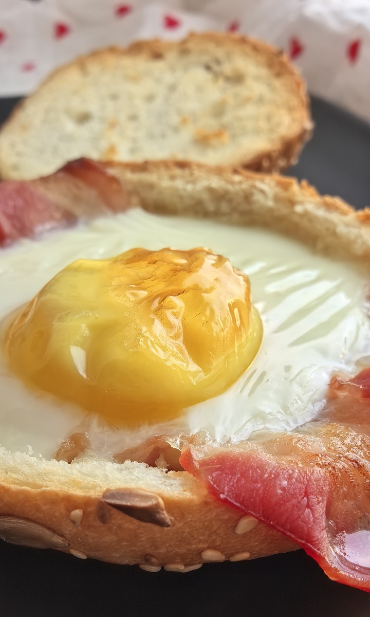 - Совершенное сочетание. Хрустящая булочка, ломтики бекона и нежное яйцо, запеченное до идеала.