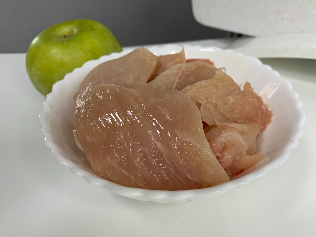 Для этого рецепта подойдет не только куриное филе, но и филе индейки, которое получится не менее сочным. Начнем с нарезки грудки на тонкие кусочки, после чего слегка отбиваем их, стараясь не переборщить.