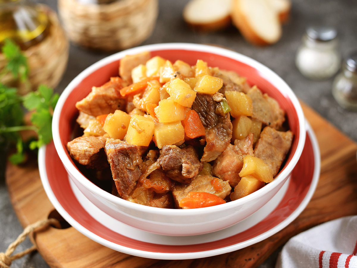 Когда мясо румяное, убавить огонь до минимума и накрыть сковороду крышкой. В процессе готовки мясо выделит сок и будет томиться еще около 30 минут. Если жидкости станет недостаточно, можно добавить немного горячей воды, чтобы предотвратить пригорание.