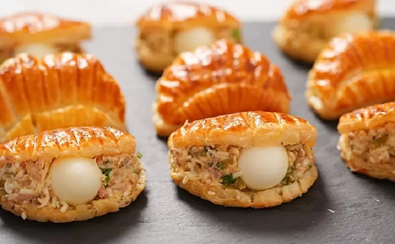 Пока тесто запекается, готовится начинка: печень трески разминается, варёные яйца натираются, а мелко нарезанные огурцы и лук добавляют яркости. Подготовленная начинка размещается внутри румяных «ракушек», где на каждую из них в центре укладывается половинка перепелиного яйца.