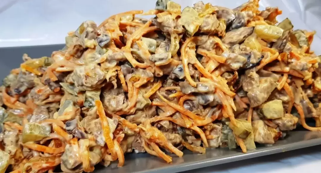 - Сытность и вкус: Праздничный салат готовится из куриной печени, соленых огурцов и корейской моркови, что обеспечивает его насыщенный вкус.