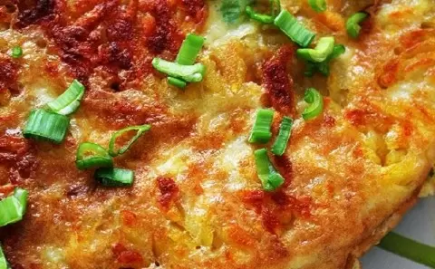 Полученная картофельная масса смешивается с яйцами, солью, перцем и куркумой. После этого выкладывается на сковороду в несколько слоев: нижний слой формирует корочку, а верхний становится мягким благодаря томлению.