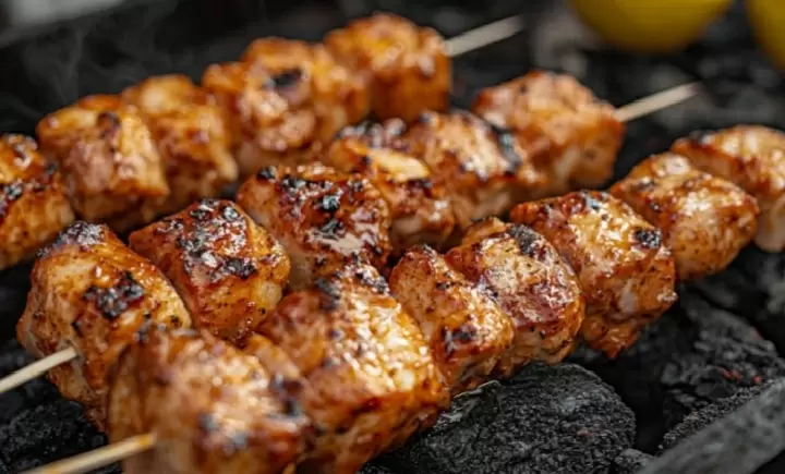 - Жарить мясо на шампурах, переворачивая.