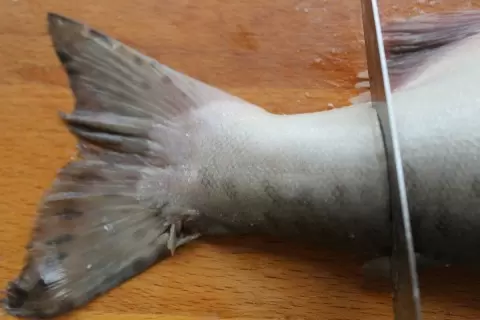 Сначала разогревайте духовку до 180-200 градусов. Затем подготовьте рыбу: очистите, потрошите и снимите филе. Приправьте его солью, специями и намажьте майонезом. Пусть филе немного промаринуется.