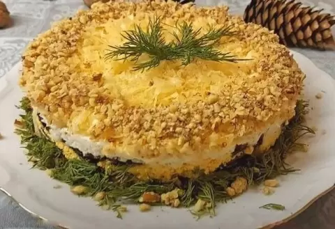Завершающим штрихом служат измельченные белки, которые необходимо укрыть слоем тертого сыра. Салат щедро посыпается орехами, предварительно измельченными с помощью скалки или блендера.