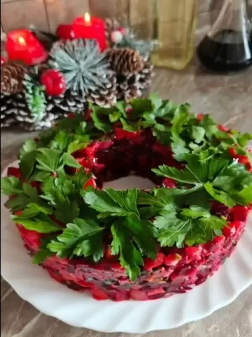 Салат перекладывают в разъёмную форму, центр заполняют стаканом, чтобы сохранить нужную форму венка. После лёгкого уплотнения форму снимают вместе со стаканом, и сверху украшают веточками петрушки.