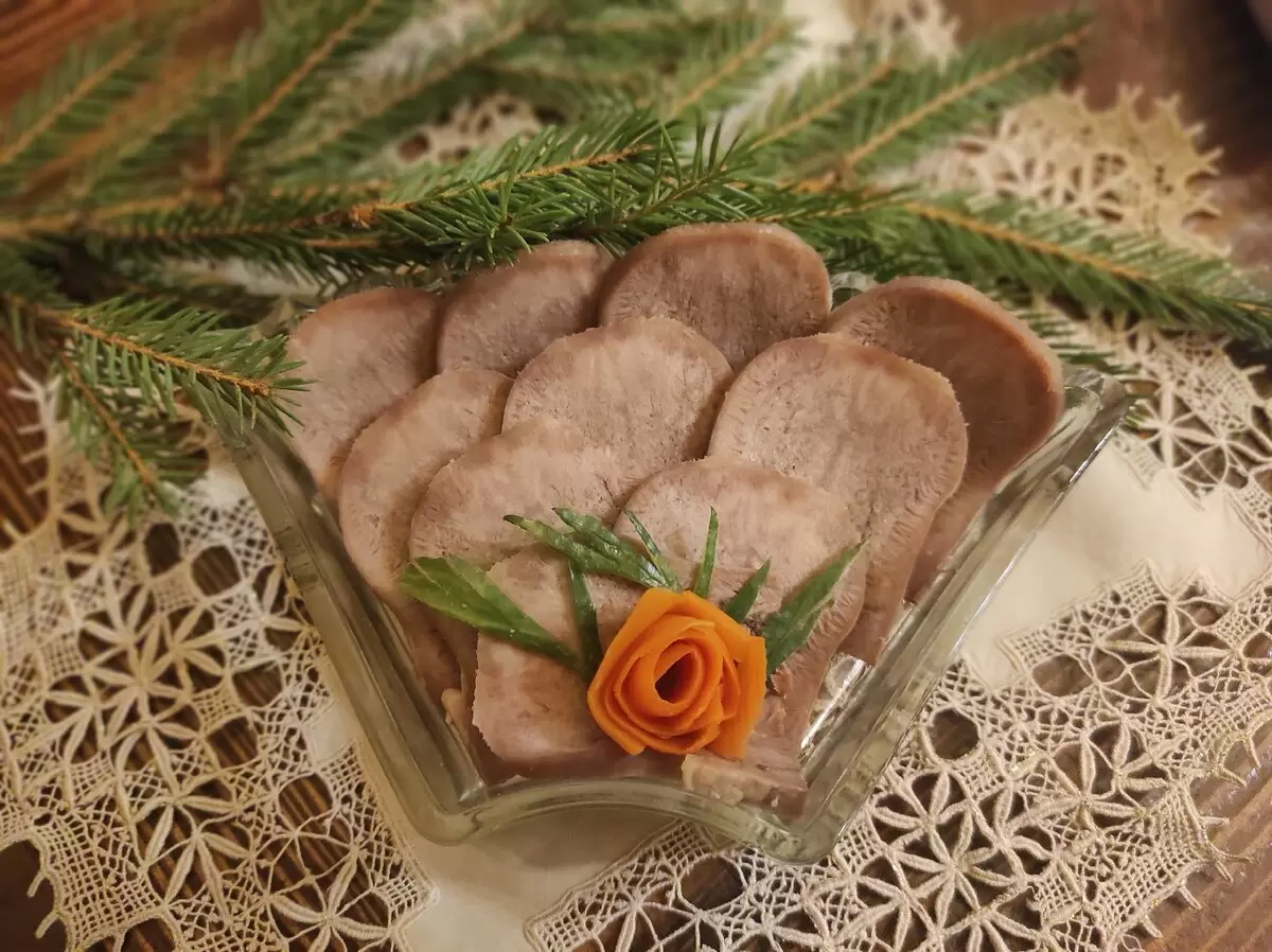 Перед подачей язык нарезают: отрезаем подъязычную часть, кончик и основание, а затем используем только среднюю, наиболее презентабельную часть. Нарезаем её на тонкие ломтики и красиво раскладываем на тарелке, подавая с хреном.