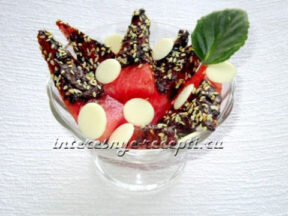 3. Пришло время финальных штрихов. Кусочек арбуза берется за основание и погружается в растопленный шоколад до половины. После этого его следует обсыпать кунжутом и аккуратно размещать на плоском блюде, чтобы шоколад застыл.