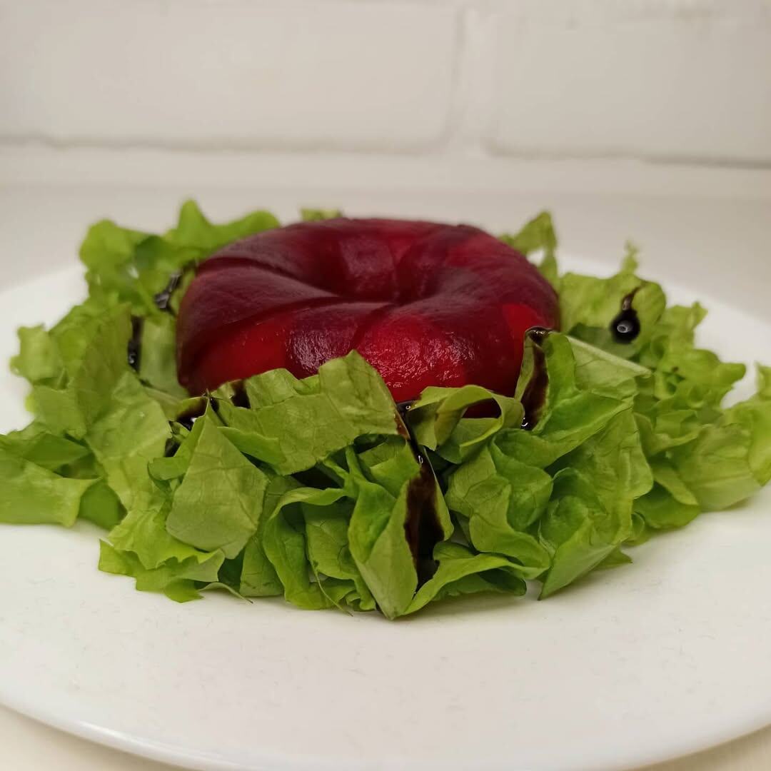 Этот уникальный салат способен удивить даже самых привередливых гурманов. Его яркая подача заставляет задуматься: "Это съесть или сфотографировать?" Сочетание свежей свеклы, нежного творожного сыра и хрустящего салата, дополненное сладким бальзамическим кремом, создаёт эффектный образ. Салат превращается в круглый шедевр — «пончик», который сразу поднимает настроение!