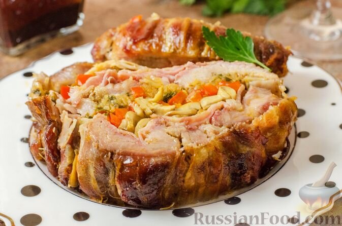 1. Свиная шея в сочетании с грибами и беконом. Это горячее блюдо не только порадует вас своей красотой, но и удивит мягкостью и насыщенным вкусом. Процесс укладки ингредиентов в форме рулета и запекания в рукаве позволяет сохранить сочность мяса и аромат овощей.