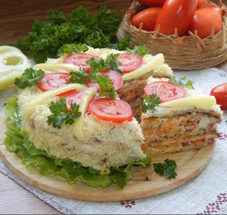 - Чередуя слои, сформировать торт и сверху посыпать натертым сыром.