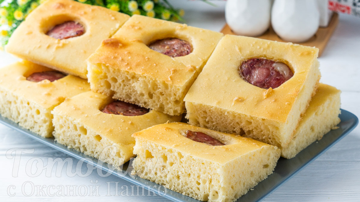 Шаг 5: После того как тесто поднялось, переложите его в форму, равномерно распределяя. На тесте разместите нарезанную колбасу так, чтобы каждый кусочек оказался в центре квадрата, когда пирог будет нарезан.