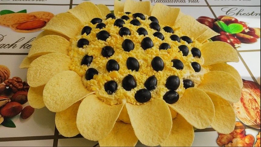 После этого выкладывайте по слоям: сначала копченое филе с майонезом, затем грибы, тертые яичные белки, кукурузу и сыр. Завершите оформление, посыпав салат натертым яичным желтком. По краям выложите чипсы, а в центр добавьте кольца маслин — так получится эффектный подсолнух. Если планируете подавать салат через 7-8 часов, лучше чипсы вставить непосредственно перед подачей, чтобы они не размокли.