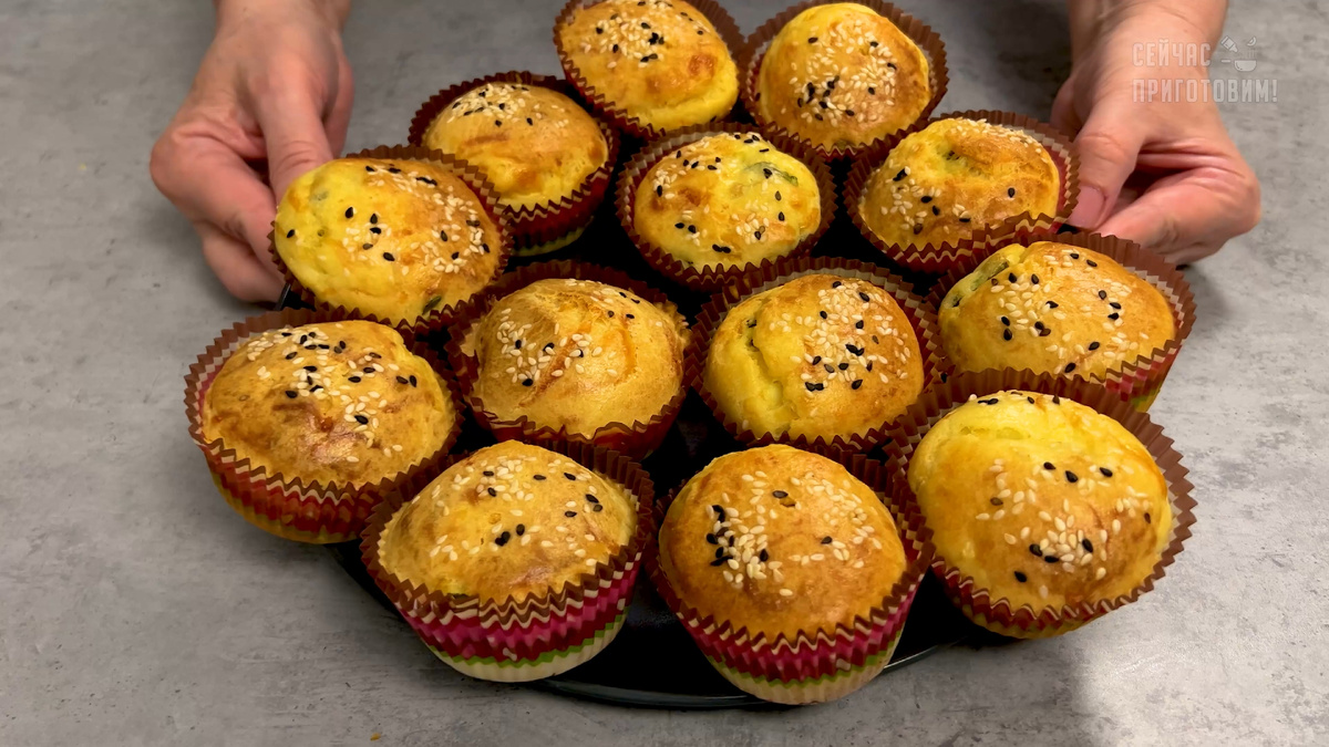 Формы для кексов застилаем бумажными стаканчиками и выкладываем немного теста на дно. Затем добавляем начинку, объединяя яйца и лук, и сверху снова заливаем тестом. Для красивой корочки посыпаем кунжутом.