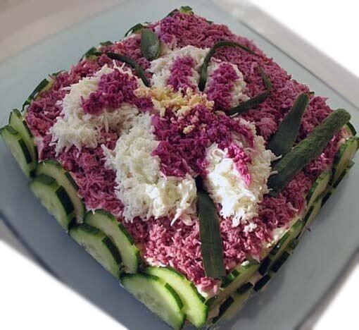Для последнего слоя натрите белки на терке и смешайте их со свекольным соком. Это придаст яркий цвет вашему блюду. Используйте получившуюся массу для украшения салата «Ирис».