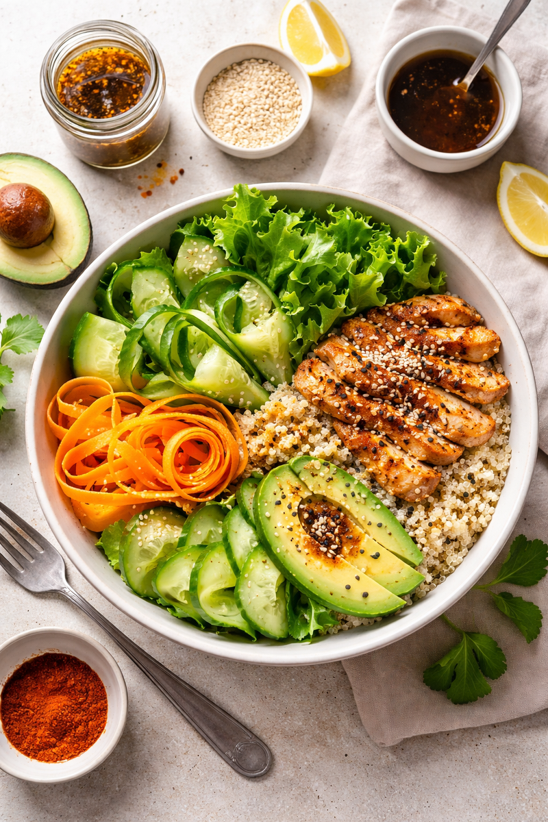 Шаг 5: В глубокую миску выложите киноа, рядом поместите курицу, овощи и салат, полейте соусом и посыпьте кунжутом.