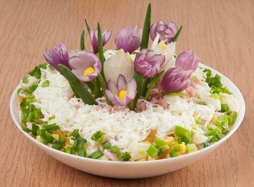 С наступлением весны все стремятся окружить себя яркими красками, и уж кто, как не цветы, способны привнести такую свежесть в наш дом? Представляем вам чудесный салат «Поляна крокусов», в котором вместо настоящих цветов используются простые луковички, создавая эффект настоящей весенней поляны на вашем столе.