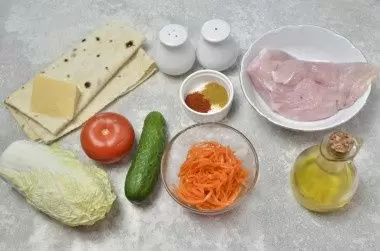 Шаг 1: Подготовка ингредиентов - Куриную грудку тщательно промыть и обсушить. Овощи нарезать: капусту нашинковать мелко, а помидор и огурец — тонкими ломтиками.