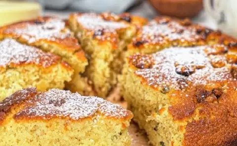 4. Разогрейте духовку до 180°C и выпекайте манник 45-55 минут. Готовность можно проверить с помощью деревянной шпажки: она должна выходить сухой. После выпекания дайте пирогу немного остыть, а затем посыпьте сахарной пудрой для изысканного вида.