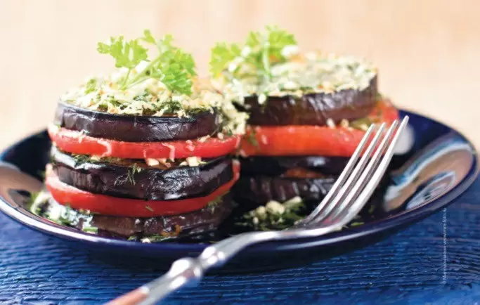 Ингредиенты: баклажан, помидор, укроп, чеснок, сыр, соль, масло. Технология проста: тонкие кружки баклажана обжарить до полуготовности, чередовать слоями зелень, помидор и сыр, запекать до расплавления сыра. Готовые башенки оставьте на минуту перед подачей — они сохранят форму и станут эффектной главной закуской.