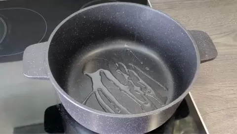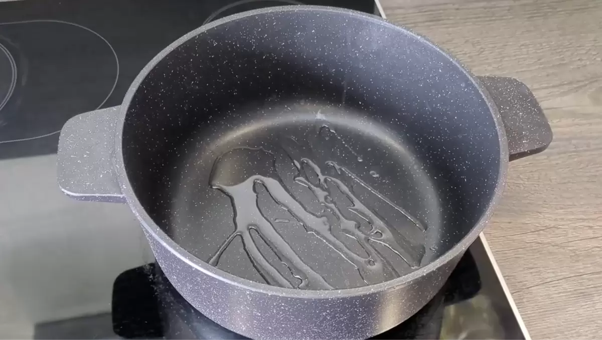Возьмите кастрюлю с толстым дном, разогрейте растительное масло. Мясо нарежьте небольшими кубиками и поместите в кастрюлю, распределив равномерно.