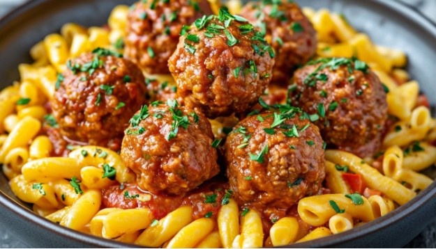Тефтели можно подавать политыми сырным соусом либо слегка запеченными в духовке. Отлично подойдут к ним макароны и свежий зеленый салат.
