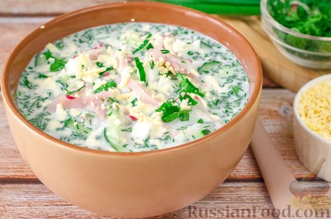 - Окрошка на кефире и минеральной воде: Этот классический холодный суп выделяется свежестью овощей и легкостью кефира. Комбинация ветчины, огурцов и редиса делает его отличным выбором для жарких дней.