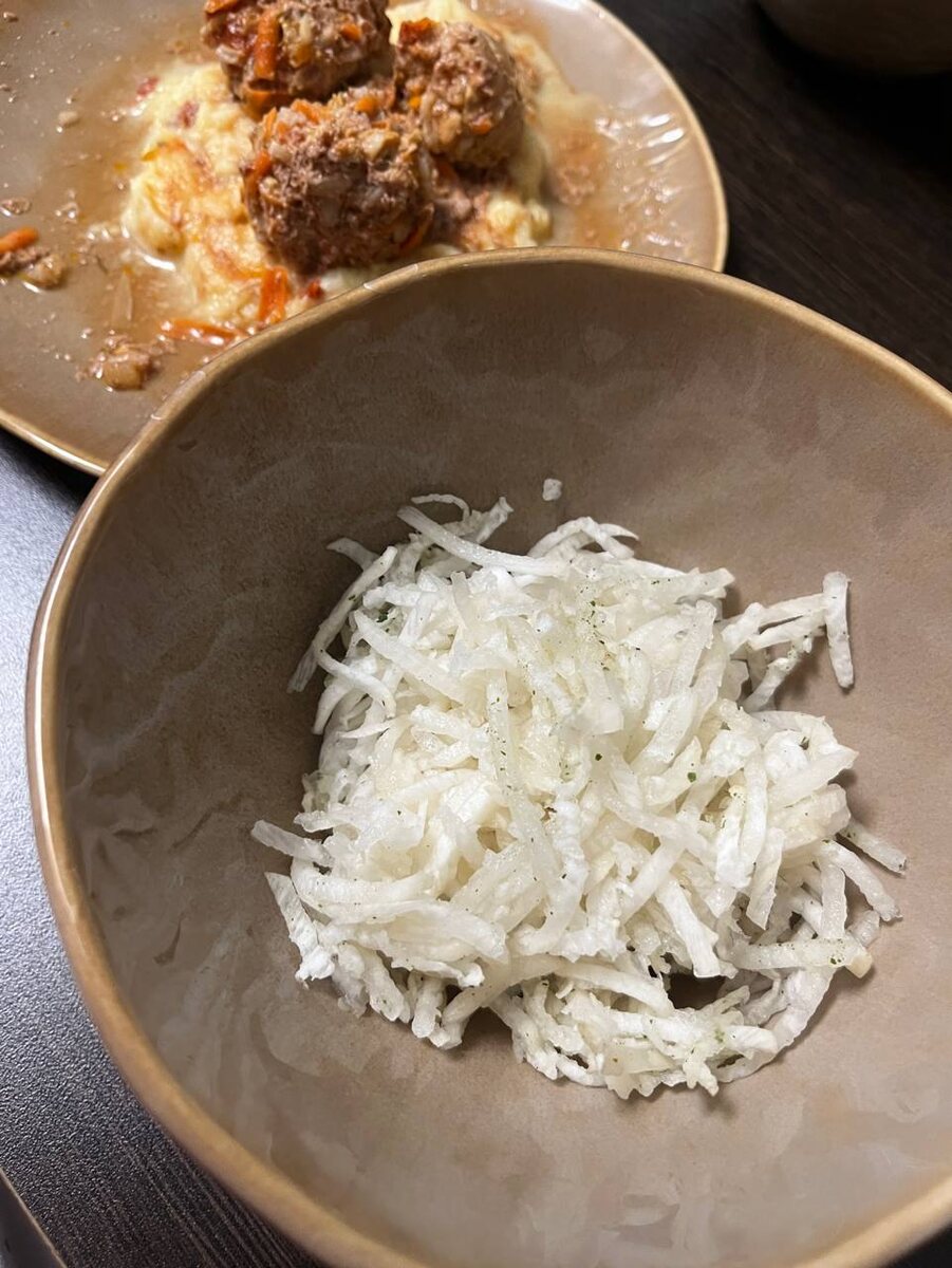 Таким образом, у нас получается аутентичное, вкусное блюдо, которое можно подавать как самостоятельный салат или в качестве гарнира. Некоторые гурманы добавляют в него говяжью грудку, которая распадается на нежные волокна, но даже в вегетарианском варианте редька будет восхитительна.
