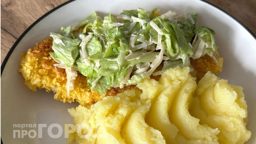 Кукурузные хлопья нужно измельчить до средней величины — кусочки должны быть размером с мелкий орех. На приготовление четырех грудок потребуется около 150–200 граммов хлопьев — этого количества хватит для создания плотного покрытия. Обжаривать курицу следует на среднем огне в раскаленном растительном масле, стараясь переворачивать животные только один раз, чтобы не повредить корочку.